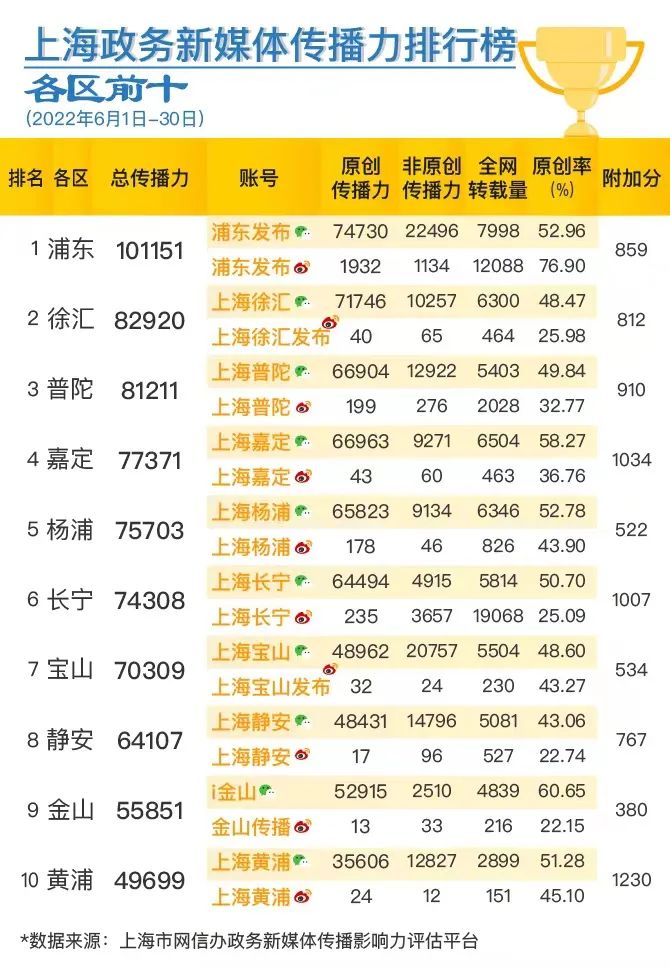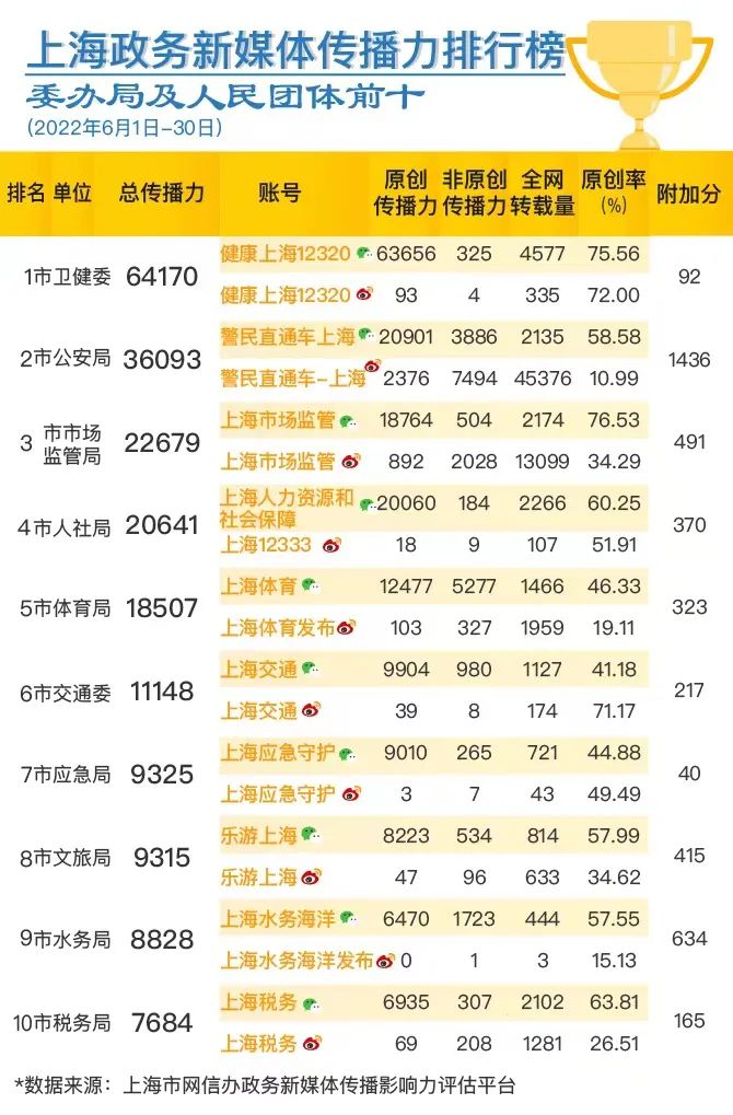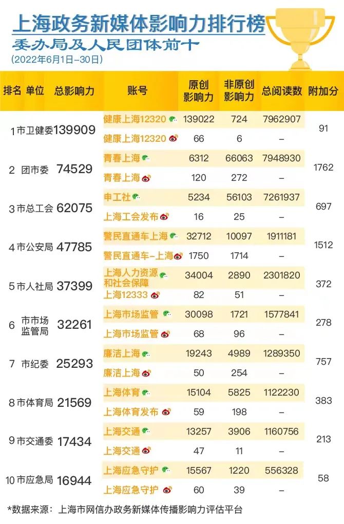 市委網(wǎng)信辦、市政府新聞辦今天聯(lián)合發(fā)布上海政務(wù)新媒體2022年6月傳播影響力榜單。