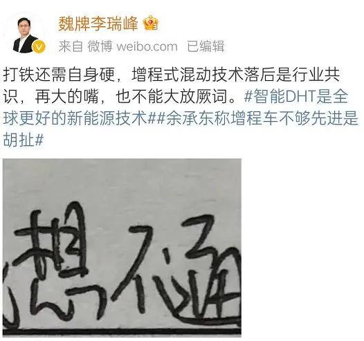 這是長城旗下品牌魏牌的CEO李瑞峰最近在網(wǎng)絡上回懟華為常務董事余承東的一句話,在此之前,余承東對外宣稱,“增程模式是目前最適合的新能源車模式”。但李瑞峰則認為,“增程式混動技術落后是行業(yè)共識”。