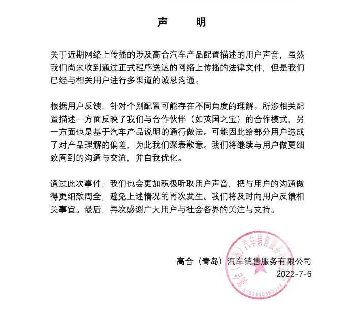 為了避免掀起更大的輿論,高合汽車及時發(fā)布聲明對此事進(jìn)行了回應(yīng)。