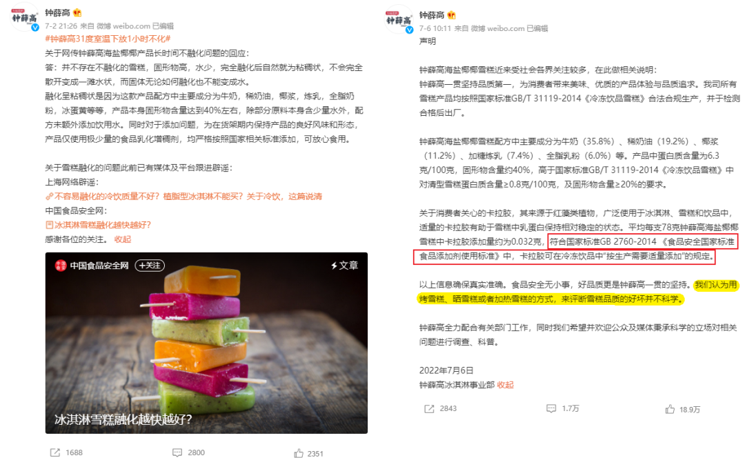 表面聽很合理,但實(shí)際上,鐘薛高這樣一家食品企業(yè),從以國家標(biāo)準(zhǔn)為支撐,開始和網(wǎng)友對線時,就已經(jīng)徹底輸了。