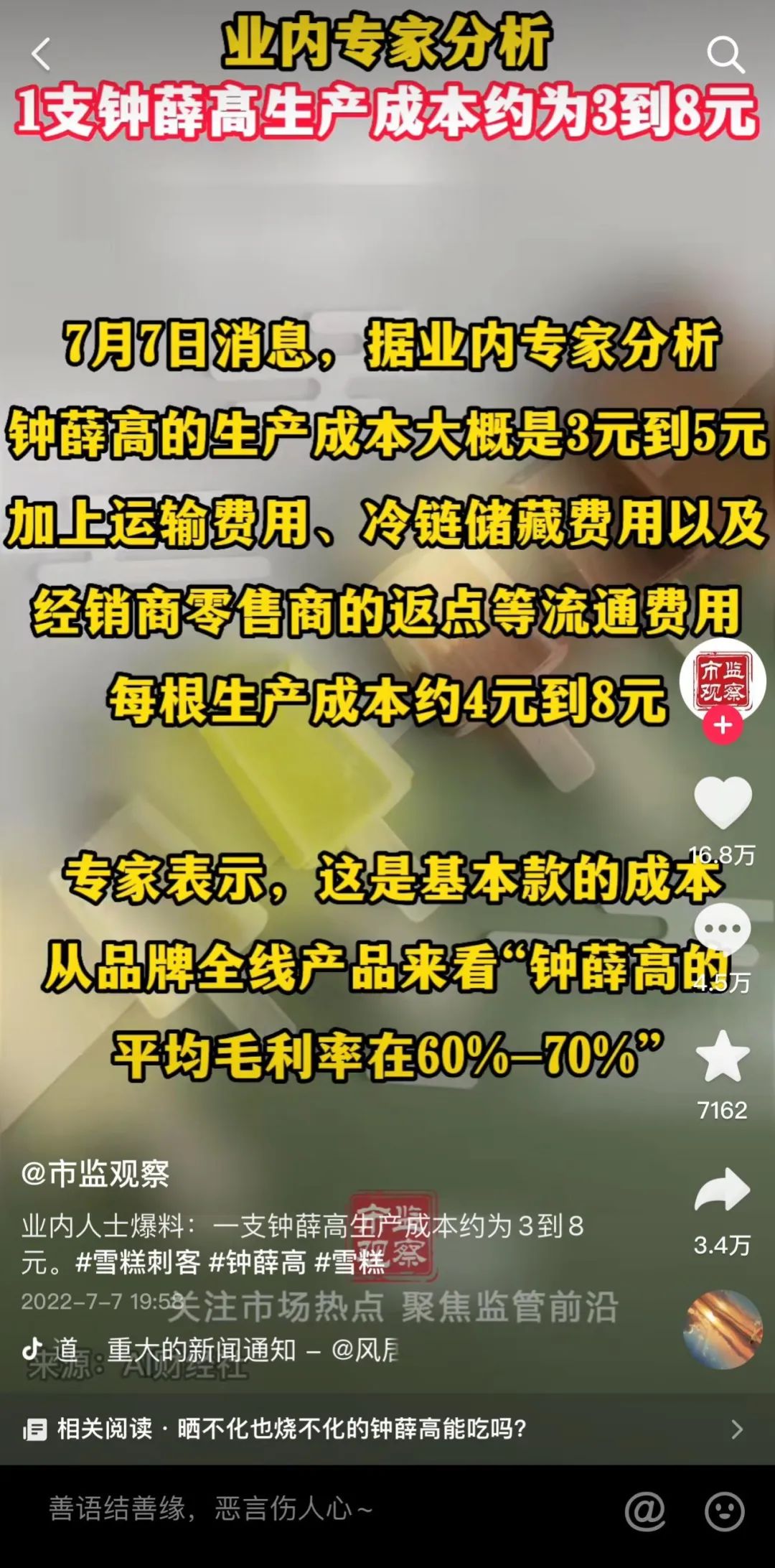 而在今年鐘薛高事件發(fā)生之后,市場觀察援引業(yè)內(nèi)專家分析,鐘薛高每根成本約為3-8元,平均毛利率在60%-70%。