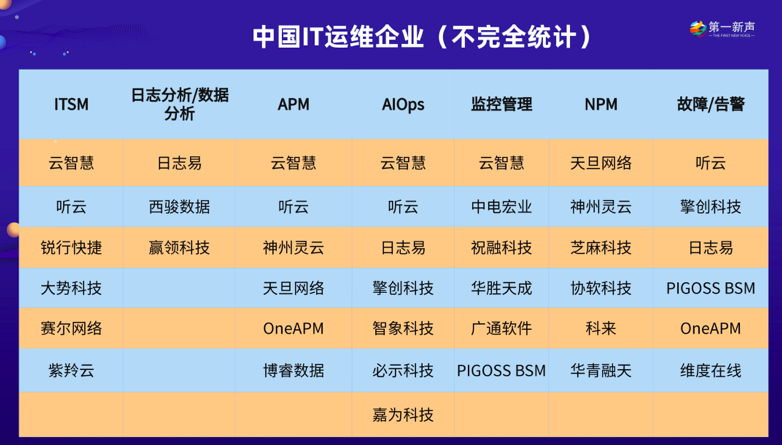第一新聲曾報道過,IT運(yùn)維領(lǐng)域包括ITOM(IT運(yùn)營管理) 、ITSM、APM、ITOA、AIOPS等細(xì)分賽道,目前國內(nèi)外頭部企業(yè)主要包括 ServiceNow、Datadog、Splunk、云智慧、西駿數(shù)據(jù)、擎創(chuàng)科技、聽云、日志易等。 根據(jù)第一新聲采訪調(diào)研發(fā)現(xiàn),在各個細(xì)分賽道中,以ITOM市場規(guī)模最大。
