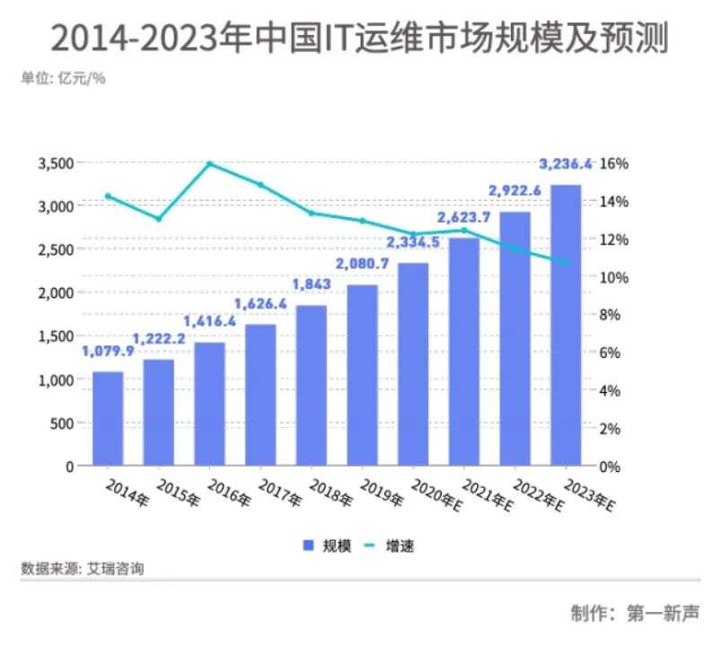 艾瑞咨詢數(shù)據(jù)顯示,2021年中國IT服務(wù)將突破萬億大關(guān),其中,IT運(yùn)維市場規(guī)模在2021年達(dá)到2941.2億元,預(yù)計2023 年達(dá)到3236.4 億元,2020-2023 年的年復(fù)合增長率為 11.7%。