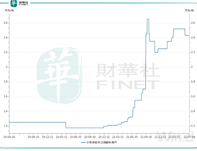 根據(jù)Wind數(shù)據(jù),2021年以來,國內(nèi)的磷酸鐵前驅體市場平均價快速上漲,由2021年年初的1.2萬元/噸飆升至年末的2.25萬元/噸。