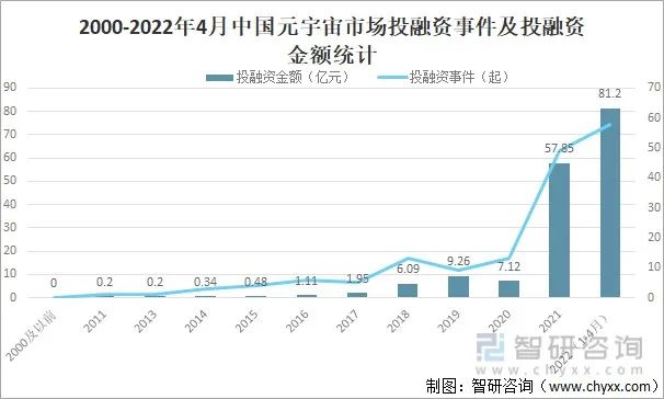 2021年,中國元宇宙市場投融資金額完成57.85億元,較2020年增加了50.73億元,同比增長712.50%,2022年1-4月中國元宇宙市場投融資金額已完成81.2億元,已超過2021年全年水平。