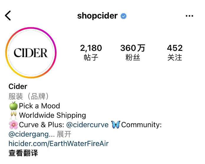 2020年成立的Cider,模式與Shein相仿,憑借著“物美價(jià)廉”的特點(diǎn),深深抓住了年輕女孩子的喜好。成立一年已獲4輪融資,目前僅在Instagram,粉絲已經(jīng)有360萬。