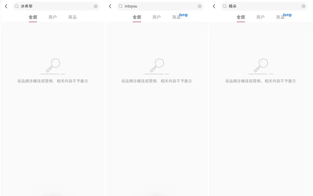 以這幾個品牌名為關(guān)鍵詞,在小紅書平臺上已經(jīng)搜索不到相關(guān)的“種草”筆記,僅出現(xiàn)了“該品牌涉嫌違規(guī)營銷,相關(guān)內(nèi)容不予展示”的界面。