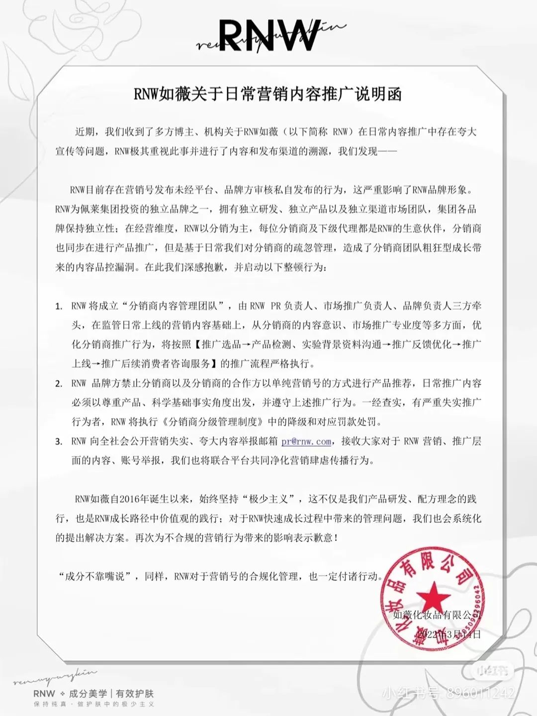 美妝品牌RNW,在3月一解封,就在小紅書發(fā)布了“RNW如薇關(guān)于日常營銷內(nèi)容推廣說明函”的公告,表示將成立“分銷商內(nèi)容管理團(tuán)隊”,監(jiān)管日常的營銷內(nèi)容,并優(yōu)化分銷商推廣行為。