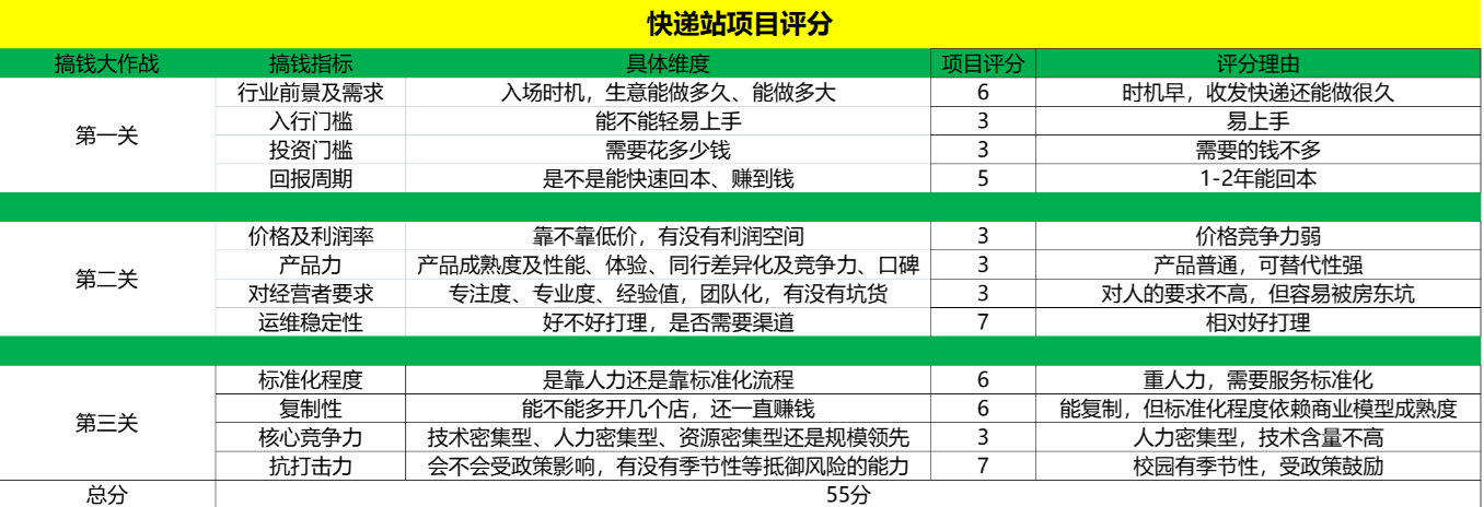 最后,我們嘗試著對(duì)小魚這個(gè)快遞站的創(chuàng)業(yè)項(xiàng)目,進(jìn)行一個(gè)不靠譜的評(píng)價(jià),主要包括12個(gè)指標(biāo),每個(gè)指標(biāo)又細(xì)化為一個(gè)具體維度,總分120分,每個(gè)子項(xiàng)目滿分10分。