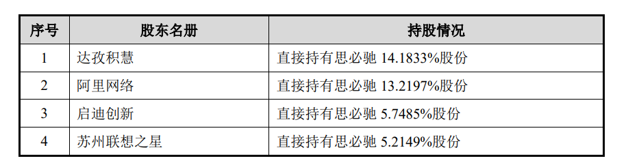 根據(jù)招股書顯示,IPO后,達(dá)孜積慧持股為12.7647%,阿里網(wǎng)絡(luò)持股為11.8974%,為公司最大的機(jī)構(gòu)股東,高始興持股為10.3754%,俞凱持股為7.1628%,啟迪創(chuàng)新持股為5.1735%,蘇州聯(lián)想之星持股為4.6933%,林遠(yuǎn)東持股為2.7916%。