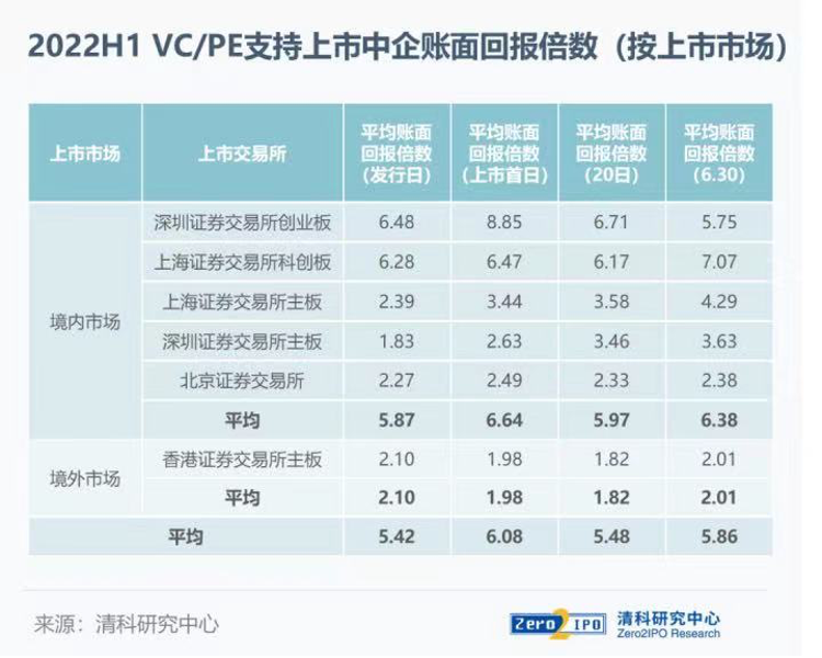 從回報(bào)倍數(shù)來看,VC/PE在境內(nèi)市場賬面回報(bào)倍數(shù)走高。清科研究中心最新數(shù)據(jù)顯示,2022年上半年,VC/PE被投企業(yè)在境內(nèi)上市的平均賬面回報(bào)倍數(shù)(按發(fā)行價(jià))達(dá)到5.87倍,相比第一季度的6.35倍略有下滑,但整體較2021年的回報(bào)仍有較大提升。其中,科創(chuàng)板和創(chuàng)業(yè)板按發(fā)行日、首日以及20日計(jì)算的賬面回報(bào)倍數(shù)均高于6倍,優(yōu)于其他板塊。與之相對的是,境外市場回報(bào)倍數(shù)持續(xù)走低。