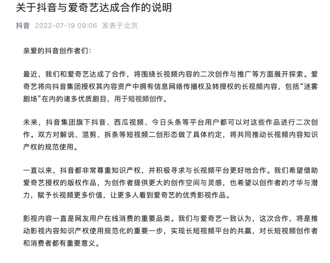 7月19日,抖音公眾號(hào)宣布,抖音與愛奇藝達(dá)成合作,將圍繞長視頻內(nèi)容的二次創(chuàng)作與推廣等方面展開探索。愛奇藝將向抖音集團(tuán)授權(quán)其內(nèi)容資產(chǎn)中擁有信息網(wǎng)絡(luò)傳播權(quán)及轉(zhuǎn)授權(quán)的長視頻內(nèi)容,包括“迷霧劇場”在內(nèi)的諸多優(yōu)質(zhì)劇目,用于短視頻創(chuàng)作。