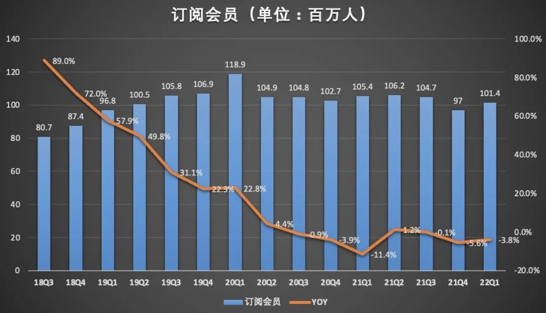 從愛奇藝的收入構(gòu)成看,會(huì)員服務(wù)收入是愛奇藝最大收入來源,其次是廣告收入。從愛奇藝的2大收入來源看,平臺(tái)用戶規(guī)模、用戶付費(fèi)率等均會(huì)對(duì)愛奇藝的收入造成重要影響。根據(jù)愛奇藝2022年一季度披露的訂閱會(huì)員規(guī)模為1.014億,較2021年第二季度1.189億的峰值,減少了1750萬。這說明,愛奇藝對(duì)用戶的吸引力和留存力不足。