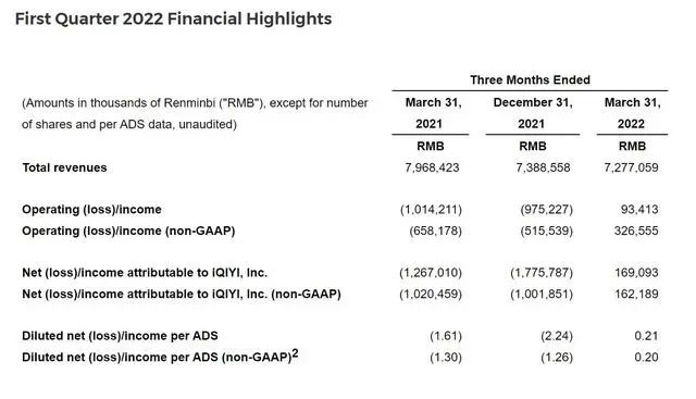 據(jù)今年一季財報顯示:愛奇藝第一季度總營收為73億元,同比下滑9%,歸屬于愛奇藝的凈利潤為1.691億元,而上年同期凈虧損13億元。