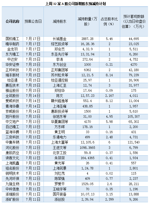 上周(7月11日至7月17日),A股公司預減持規(guī)模有所減少。據(jù)界面新聞不完全統(tǒng)計,共有32家A股公司披露股東減持計劃。