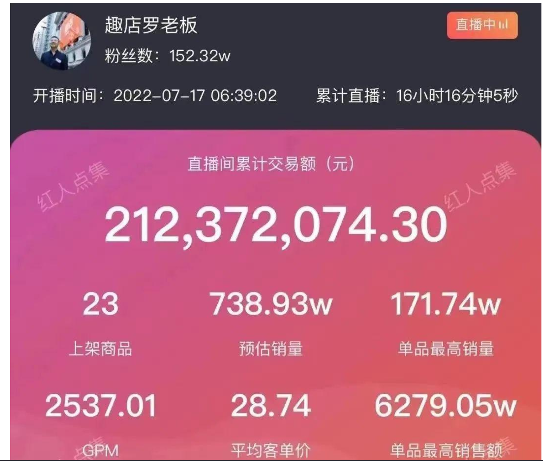 這一次,他帶著預(yù)制菜回到戰(zhàn)場(chǎng),歡快的BGM配上送iPhone、“0.01元搶購(gòu)酸菜魚”的瘋狂喊麥,7月17日的抖音直播,“趣店羅老板”在19小時(shí)的時(shí)間里,觀看人數(shù)達(dá)到9587萬人次。訂單銷量等指標(biāo)打破了抖音的記錄。賬號(hào)“趣店羅老板”單日累計(jì)漲粉397萬人,連續(xù)15小時(shí)在抖音直播間帶貨榜排名第一。