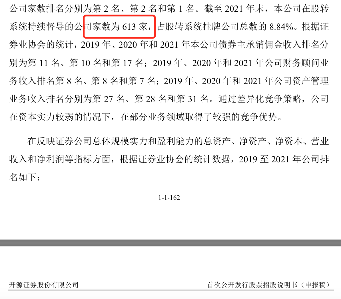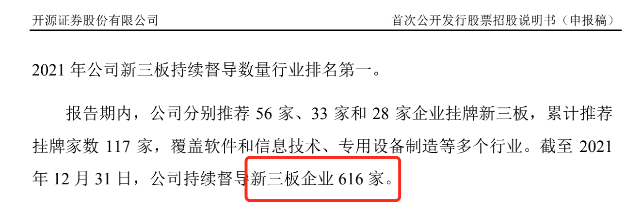 有個小瑕疵是,在說明書162頁,開源證券曾說截至2021年末,股轉(zhuǎn)系統(tǒng)持續(xù)督導(dǎo)公司家數(shù)為613家,但在197頁顯示公司持續(xù)督導(dǎo)新三板企業(yè)616家。
