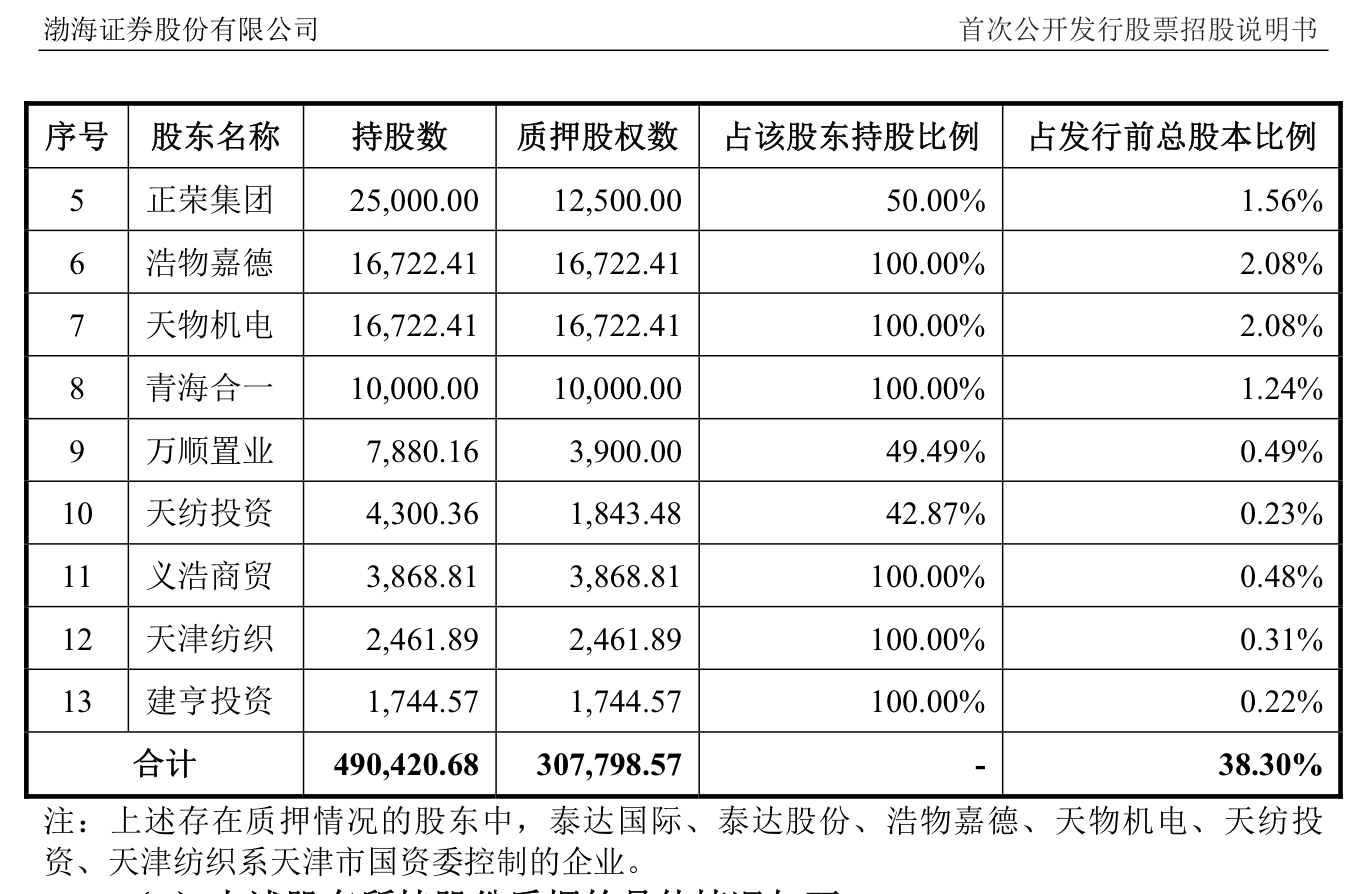 渤海證券大股東股權(quán)質(zhì)押的事是繞不開的。據(jù)悉,泰達(dá)國際直接持有公司股份21.67億股,占發(fā)行前總股本的26.96%,是公司的控股股東,其已質(zhì)押6.43億股,占發(fā)行前總股本的8%;泰達(dá)股份(000652.SZ)直接持有公司股份10.5億股,占發(fā)行前總股本的13.07%,是公司的第二大股東,其已質(zhì)押9.37億股,占發(fā)行前總股本的11.66%;合計(jì)質(zhì)押股份占發(fā)行前總股本的19.66%。這泰達(dá)國際由泰達(dá)控股持股53%,泰達(dá)股份的控股股東也是泰達(dá)控股,渤海證券的實(shí)際控制人為天津市國資委,天津市國資委最終控制的渤海證券的股東家數(shù)為14家,控制的股權(quán)比例合計(jì)為63.28%。