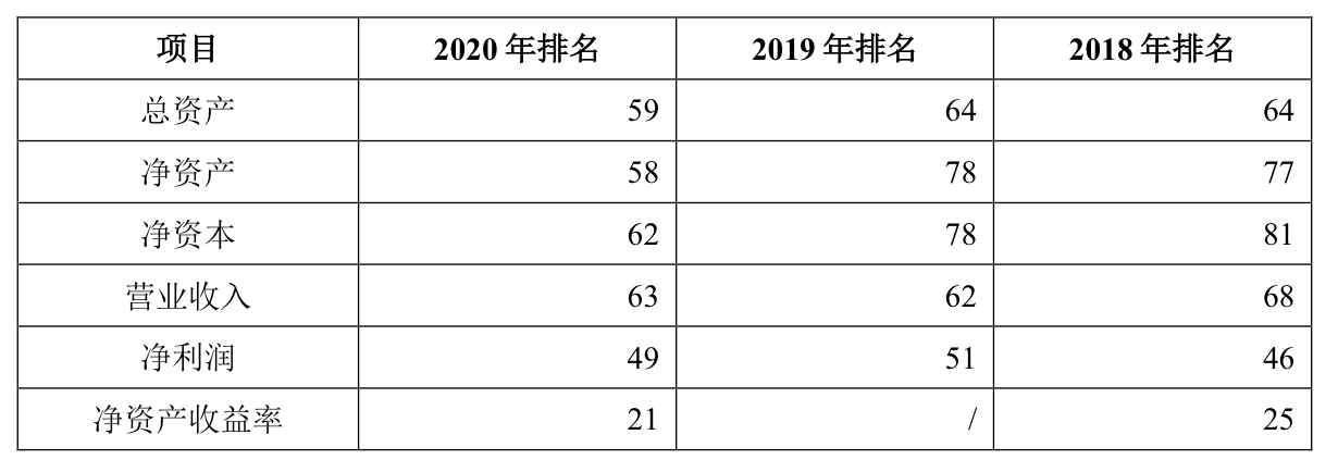 根據(jù)中國證監(jiān)會機(jī)構(gòu)監(jiān)管綜合信息系統(tǒng)(CISP報(bào)送系統(tǒng)),公司2021年末總資產(chǎn)、凈資產(chǎn)排名分別為第42名、第47名;2021年?duì)I業(yè)收入、凈利潤排名分別為第46名、第47名。
