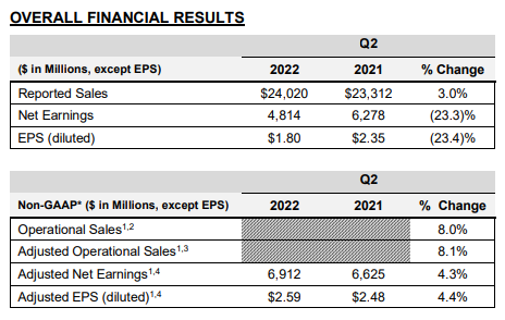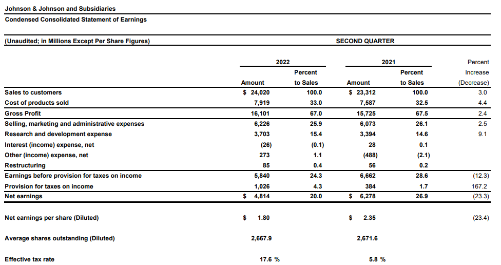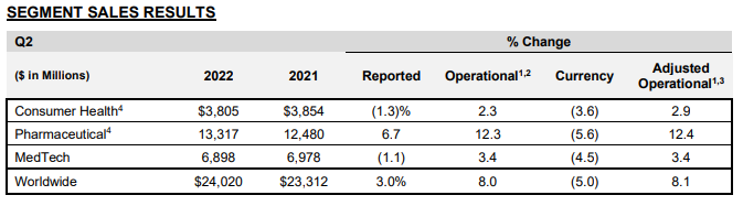 2022年二季度,強(qiáng)生全球銷售額為240億美元(約1620億元人民幣),同比增長3.0%,去除并購/資產(chǎn)剝離和匯率影響后同比增長8.1%。每股收益1.80美元(約12元人民幣),下降23.4%,調(diào)整后每股收益2.59美元(約17.5元人民幣),增長4.4%。