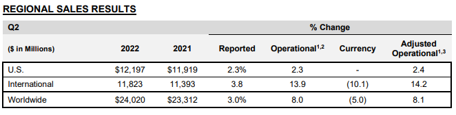 將美國以外海外市場細(xì)分來看,2022年二季度歐洲地區(qū)銷售額為60.85億美元(約410億元人民幣),同比增長7.3%,調(diào)整后同比增長20.7%;西半球(除美國外)地區(qū)銷售額15.36億美元(約103億元人民幣),同比增長12.4%,調(diào)整后同比增長14.9%;亞太及非洲地區(qū)銷售額42.02億美元(約283億元人民幣),同比增長3.6%,調(diào)整后同比增長4.7%。