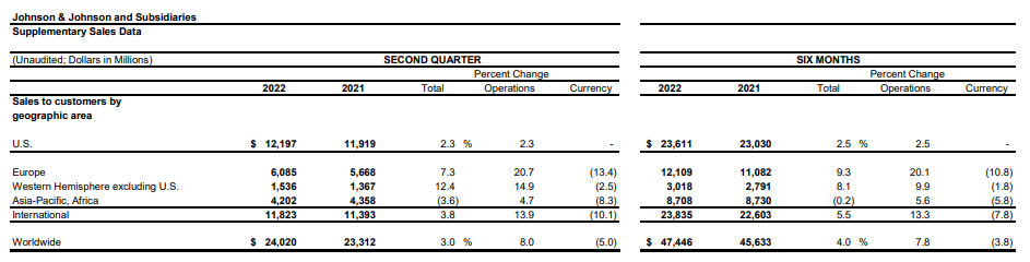 分區(qū)域看,強(qiáng)生2022年二季度在美國的銷售額為121.97億美元(約823億元人民幣),超過全球總銷售額的一半,同比增長2.3%,去除匯率影響調(diào)整后同比增長2.4%。