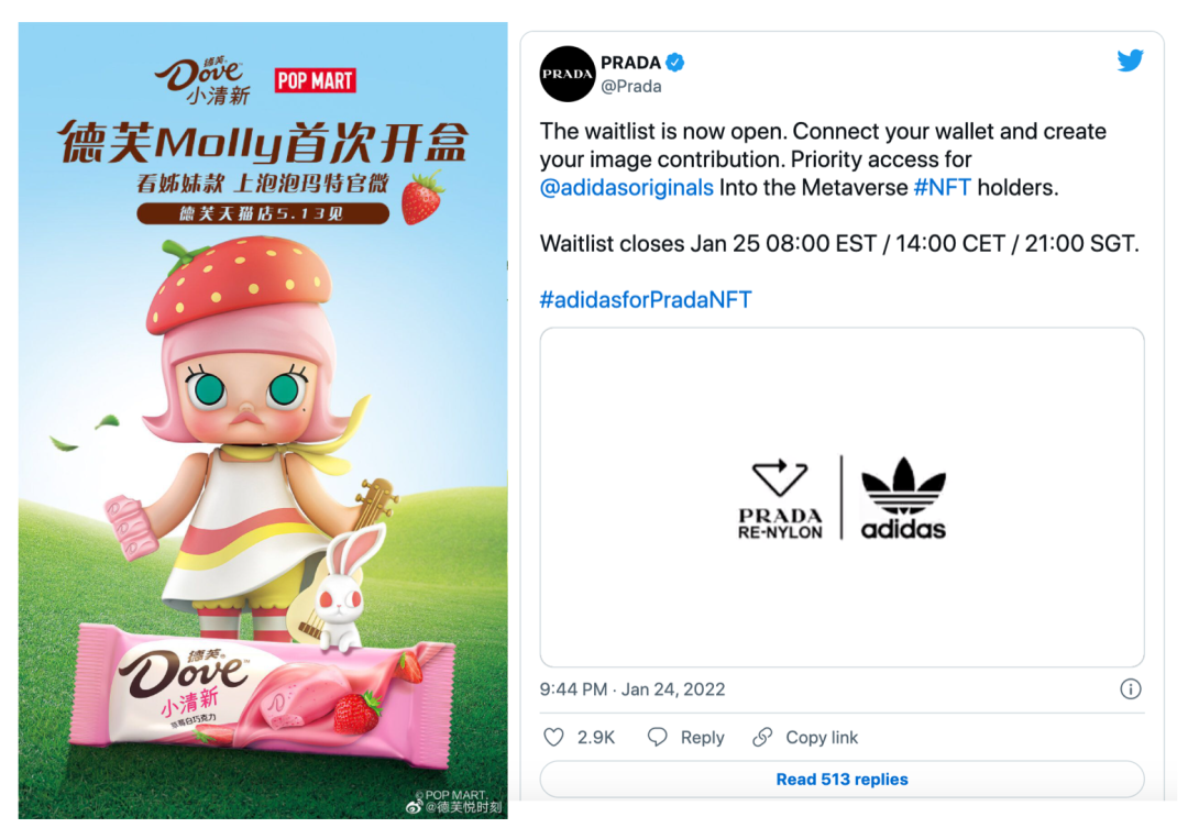 例如近年來泡泡瑪特就一直是頗受歡迎的跨界聯(lián)名對象,從食品飲料、美妝護膚到咖啡茶飲、時尚輕奢,眾多領(lǐng)域里的品牌都曾與其聯(lián)名。今年奢侈品牌、運動品牌和潮流服飾品牌也都“卷”進了NFT領(lǐng)域,Gucci、Prada、adidas、李寧等品牌都選擇在聯(lián)名時推出NFT系列產(chǎn)品。