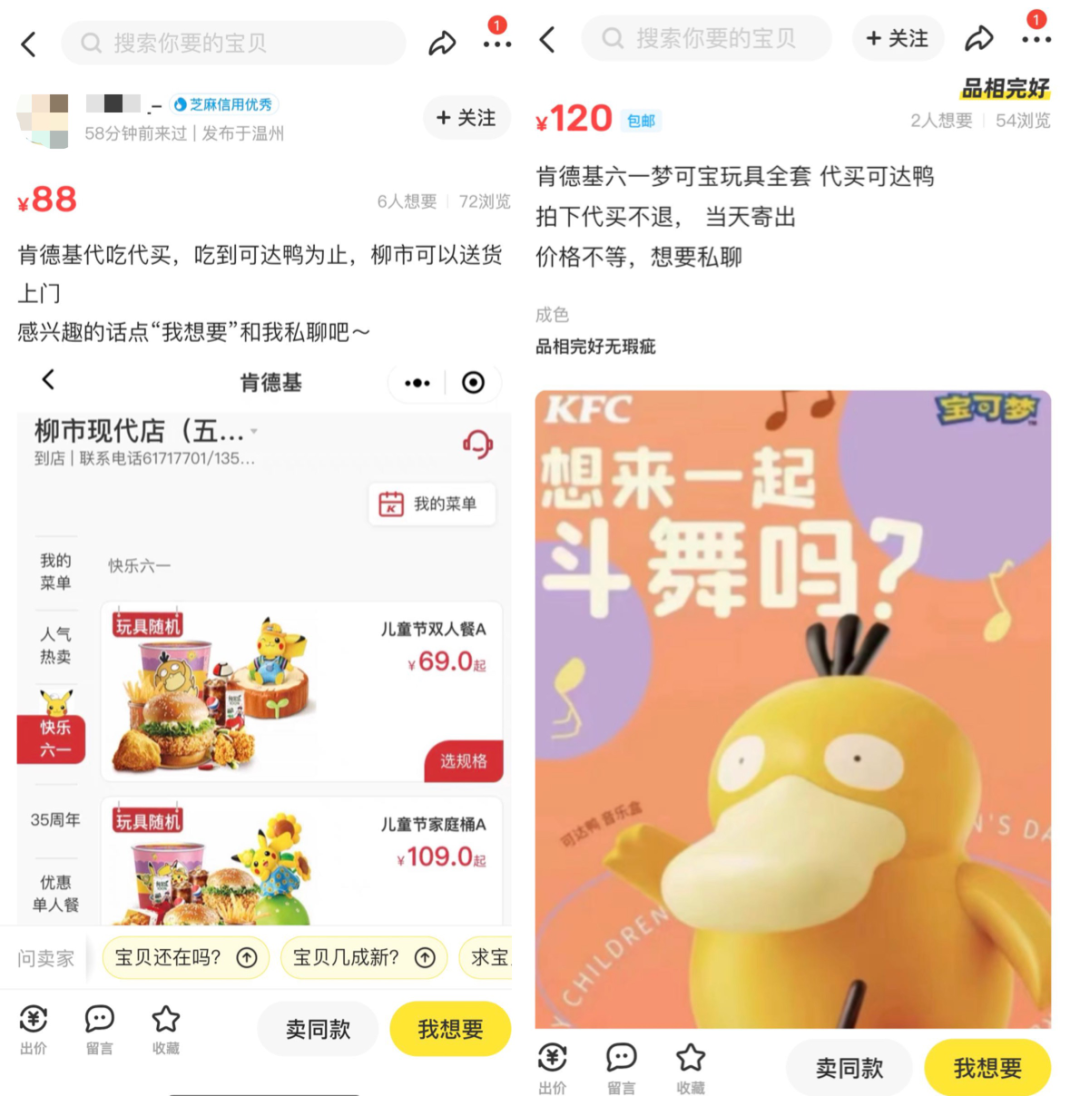 今年年初,肯德基聯(lián)名泡泡瑪特推出了一款可以獲得盲盒的套餐,率先買到的人在社交平臺上曬著“戰(zhàn)績”,“代吃”業(yè)務(wù)被催生出來,有人一次性花費上萬元買套餐也成為熱門話題。之后肯德基和寶可夢聯(lián)名推出帶有玩具的套餐,哄搶現(xiàn)象又出現(xiàn),更多人聽到“一鴨難求”呼聲后反而也加入到了搶可達鴨的行列中。