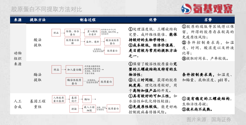 從制備方法來(lái)看,全球范圍內(nèi),由于具備工藝成熟、提取制備的膠原活性強(qiáng)等優(yōu)勢(shì),動(dòng)物組織膠原提取技術(shù)仍為主流膠原制備技術(shù)。