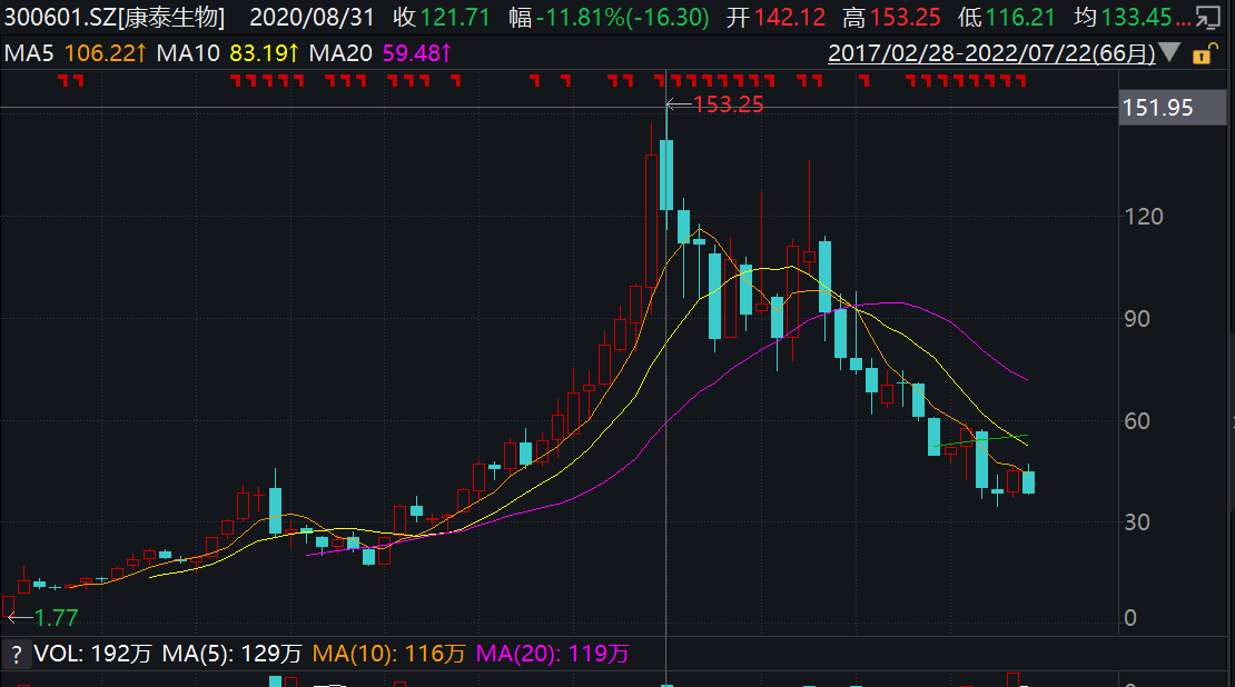 從二級市場的股價來看,自2020年新冠疫情爆發(fā)以來,康泰生物的股價從2019年末的52元連續(xù)拉升至8月底的153.25億元,創(chuàng)下歷史新高。隨著疫情的反復,該股股價呈現(xiàn)博弈狀態(tài),并在2021年5月底被拉升至136.4元。今年以來,康泰生物的股價持續(xù)走低,當前股價為38.2元/股,較2021年5月高點跌幅已超6成。