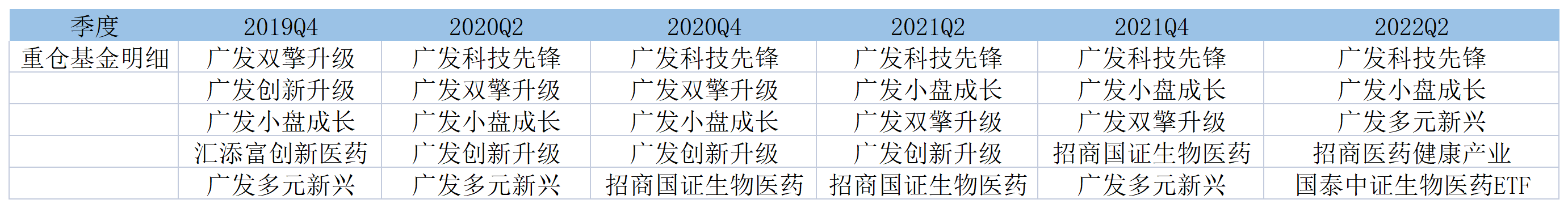 如果將統(tǒng)計范圍拓展到2019年四季度至今,劉格菘對康泰生物一往情深,廣發(fā)科技先鋒、廣發(fā)小盤成長、廣發(fā)多元新興、廣發(fā)創(chuàng)新升級、廣發(fā)雙擎升級等5只基金一度居前五位。