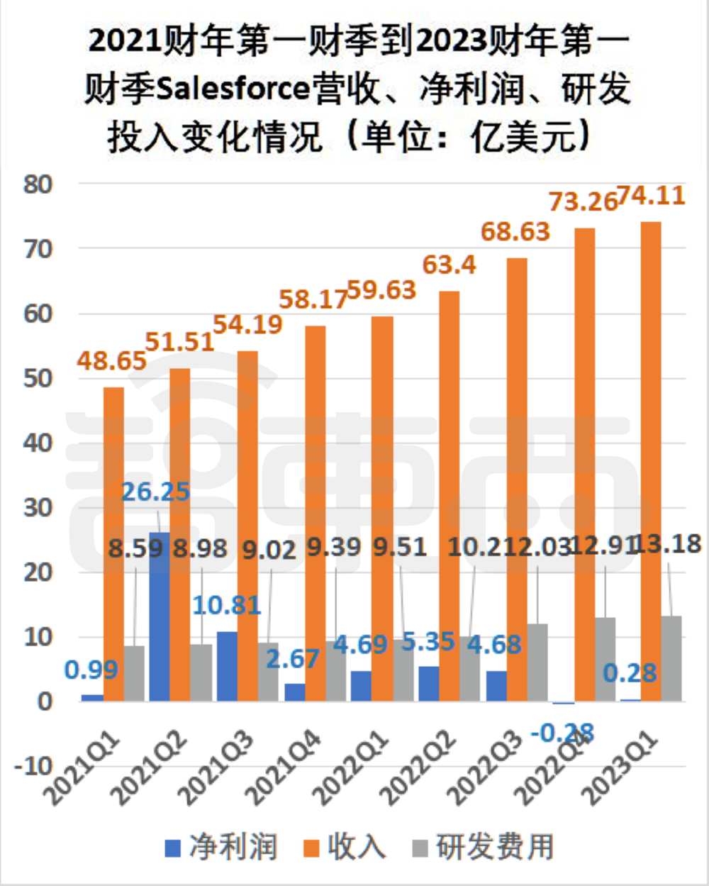 ▲2021財(cái)年第一財(cái)季到2023財(cái)年第一財(cái)季,Salesforce營收、凈利潤、不按照美國通用會(huì)計(jì)準(zhǔn)則調(diào)整后凈利潤變化情況