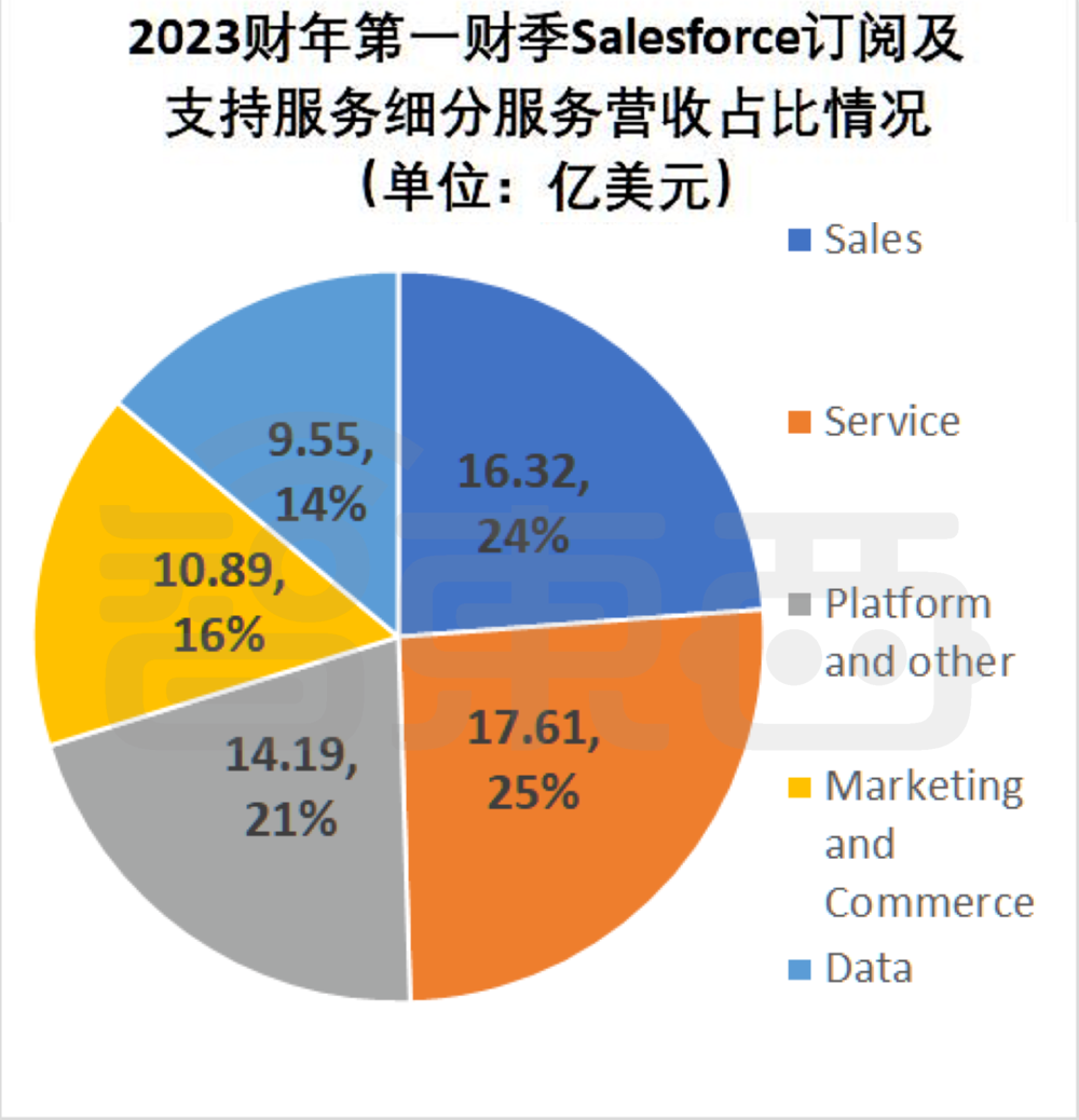 在2023財(cái)年第一財(cái)季,Salesforce這五類業(yè)務(wù)的營收分別為16.32億美元、17.61億美元、14.19億美元、10.89億美元、9.55億美元;同比增長(zhǎng)分別為20%、19%、58%、24%、15%。云平臺(tái)及其他業(yè)務(wù)部分的營收同比增長(zhǎng)幅度最大。這五類業(yè)務(wù)中服務(wù)云的營收占比最高。