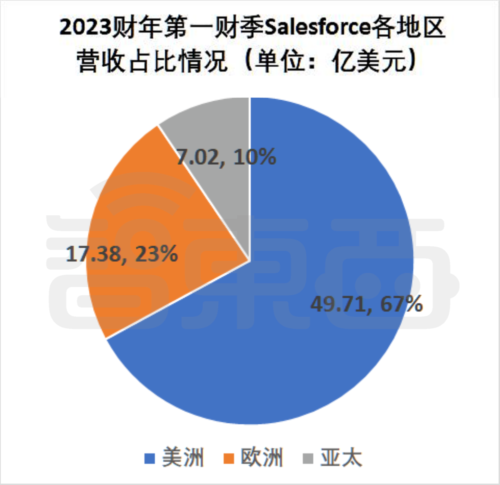Salesforce的營收主要是來自美洲、歐洲、亞太三個(gè)區(qū)域,以美洲為主。Salesforce 2023財(cái)年第一財(cái)季的美洲區(qū)域收入為49.71億美元,占總收入的66.67%;歐洲區(qū)域的收入為17.38億美元,占比為23.45%,亞太區(qū)域的收入為7.02億美元,占比為9.47%。