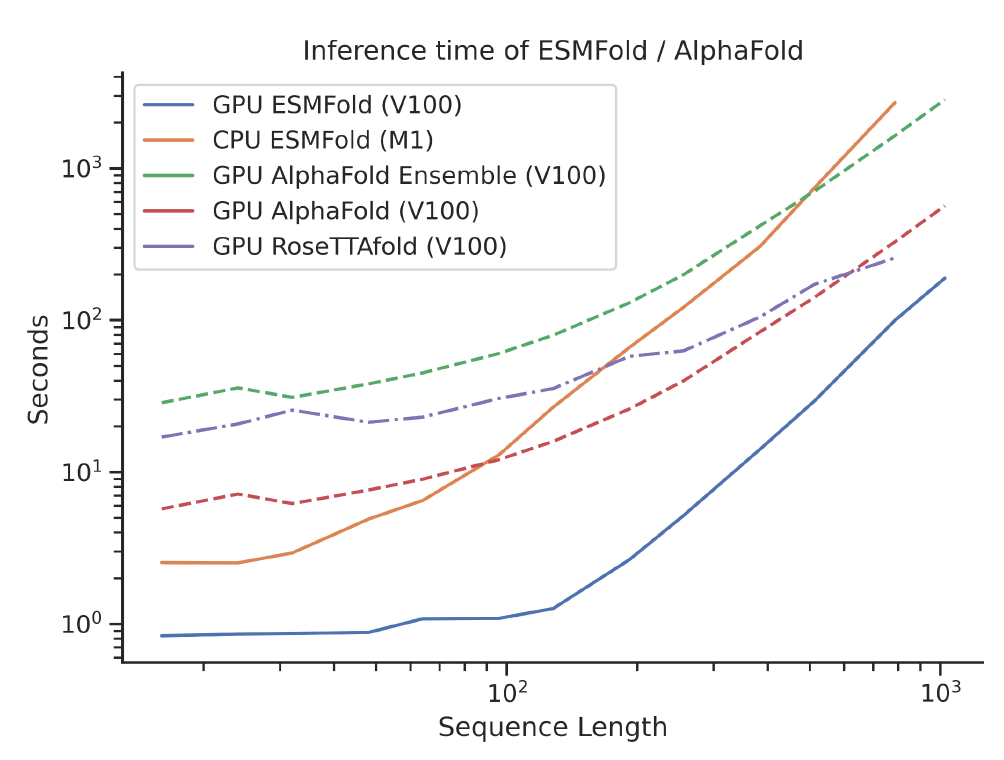 例如在單個NVIDIA V100 GPU上,使用較少參數的ESMFold在14.2秒內對具有384個殘基的蛋白質進行預測,可比單個AlphaFold2模型快6倍。而在較短的序列上,我們甚至看到了約60倍的改進。