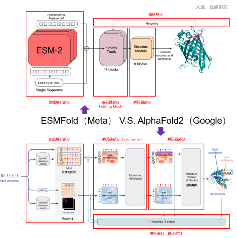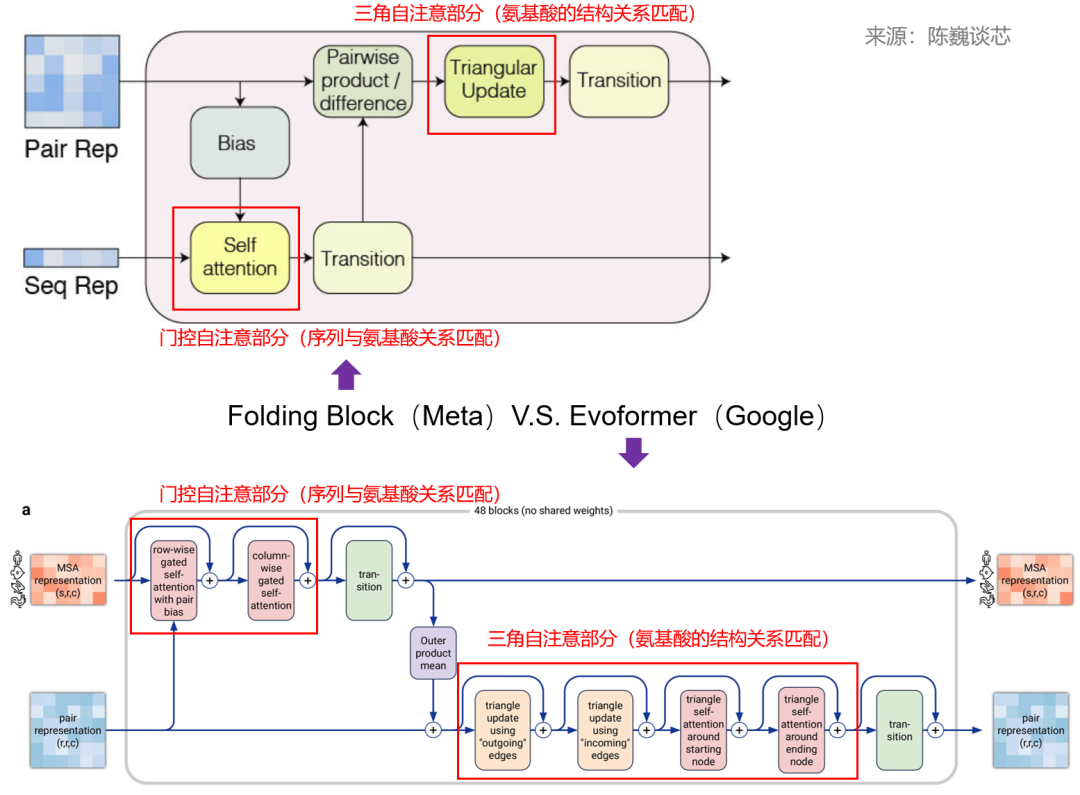 ▲ESMFold Folding Block與AlphaFold2 Evoformer結構對比