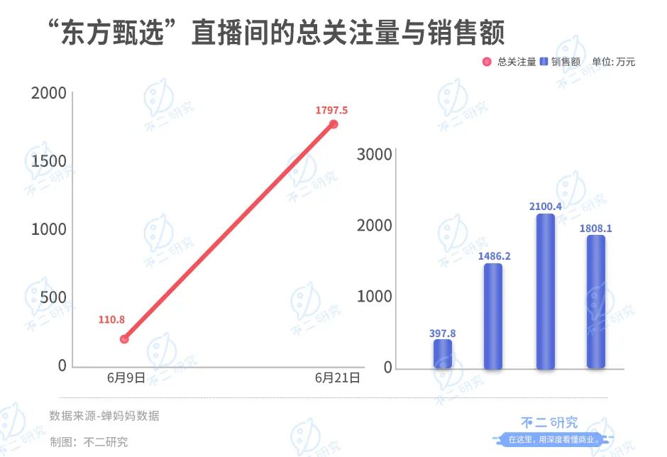 最新出圈的閃耀明星就是新東方的董宇輝老師,他的爆火讓“東方甄選”直播間的關(guān)注量完成逆襲。據(jù)蟬媽媽數(shù)據(jù),“東方甄選”直播間的總關(guān)注量從6月9日的110.8萬,躍升至6月21日1797.5萬,不到兩周翻了16倍有余