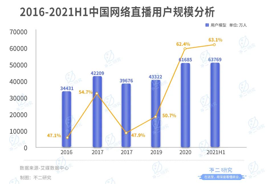 艾媒數(shù)據(jù)顯示,截至2021年6月,我國(guó)網(wǎng)絡(luò)直播用戶規(guī)模達(dá)6.38億,與2020年同期相比增長(zhǎng)47.2%,占網(wǎng)民整體的63.1%。
