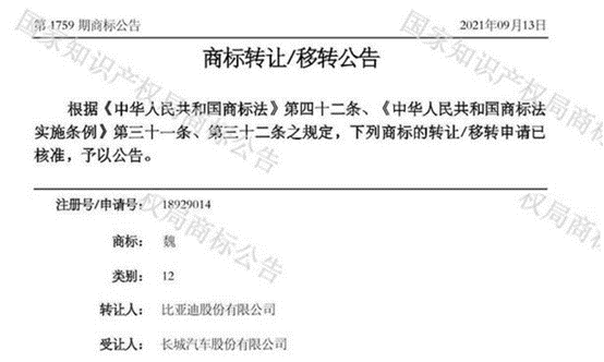 起初,魏牌的商標并不在長城汽車的手上。原本魏牌注冊在比亞迪旗下,作為其王朝系列中備用的品牌之一。2021年,經(jīng)過幾經(jīng)輾轉,長城汽車從比亞迪手中受讓,迎接回來。