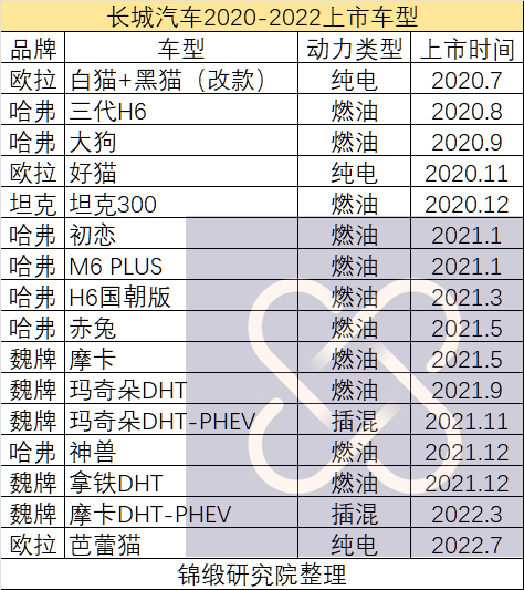 在2020-2022年間,長城汽車不僅沒有提前規(guī)劃新能源汽車的C端布局,而且在C端放量之后一年多的時間里,也仍未正式布局新能源車中高端產(chǎn)品線。在2020-2022年間,長城總共上市16款車型,只有5款算新能源產(chǎn)品,能上綠牌,而其中純電車只有3款。總體產(chǎn)品布局還是在吃哈弗的“老本”,放養(yǎng)魏牌的高端,靠了無劃時代感的新能源車在新牌桌周圍混臉熟。
