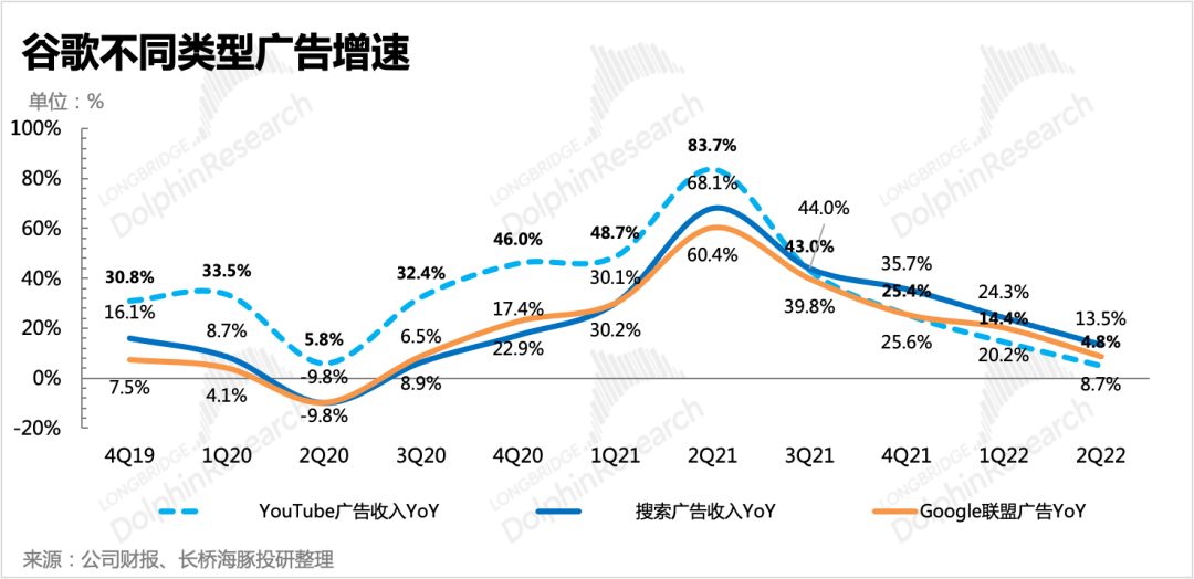 從不同廣告類型上看,主要靠搜索廣告的增長(zhǎng)韌性支撐,而YouTube廣告這類偏社交平臺(tái)屬性的廣告,則因?yàn)楹暧^環(huán)境、競(jìng)爭(zhēng)因素以及高基數(shù)等多重影響下,只有不到5%的增長(zhǎng),情況與Snap類似,僅有的優(yōu)勢(shì)是YouTube的廣告會(huì)較少受到蘋(píng)果ATT的影響。