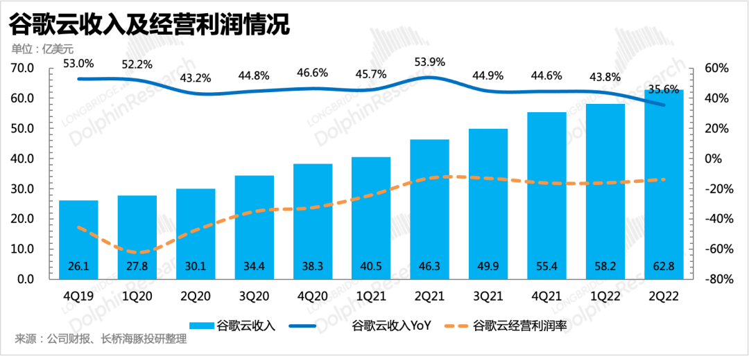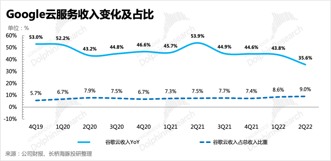二季度云業(yè)務(wù)實(shí)現(xiàn)63億收入,同比增長(zhǎng)36%,與預(yù)期持平。雖然增速上環(huán)比上季度有所下滑,但也有去年同期高基數(shù)的影響。云業(yè)務(wù)增長(zhǎng)穩(wěn)定,除了本身To B業(yè)務(wù)更換成本高使得客戶粘性強(qiáng)外,去年底谷歌拿的幾個(gè)長(zhǎng)期合同訂單,也對(duì)一定時(shí)間內(nèi)的云業(yè)務(wù)收入提供了一些保證。