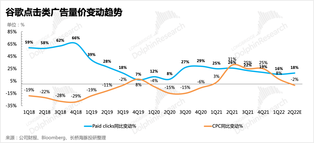 上季度谷歌的CPC報(bào)價(jià)的增速已經(jīng)相比投放量更加放緩,雖然業(yè)績(jī)快報(bào)中不披露廣告單價(jià)與投放量指標(biāo)(后續(xù)完整財(cái)報(bào)會(huì)披露),但如果從上季度的趨勢(shì),以及參考 Cowen的專家調(diào)研(僅代表專家所在廣告代理機(jī)構(gòu)的投放情況)——二季度他們觀察到CPC報(bào)價(jià)增速相比一季度進(jìn)一步放緩,市場(chǎng)對(duì)谷歌CPC的預(yù)期直接已經(jīng)從一季度的8%增長(zhǎng)調(diào)整至同比下滑2%,說(shuō)明經(jīng)濟(jì)需求確實(shí)表現(xiàn)出了邊際疲軟的趨勢(shì)。