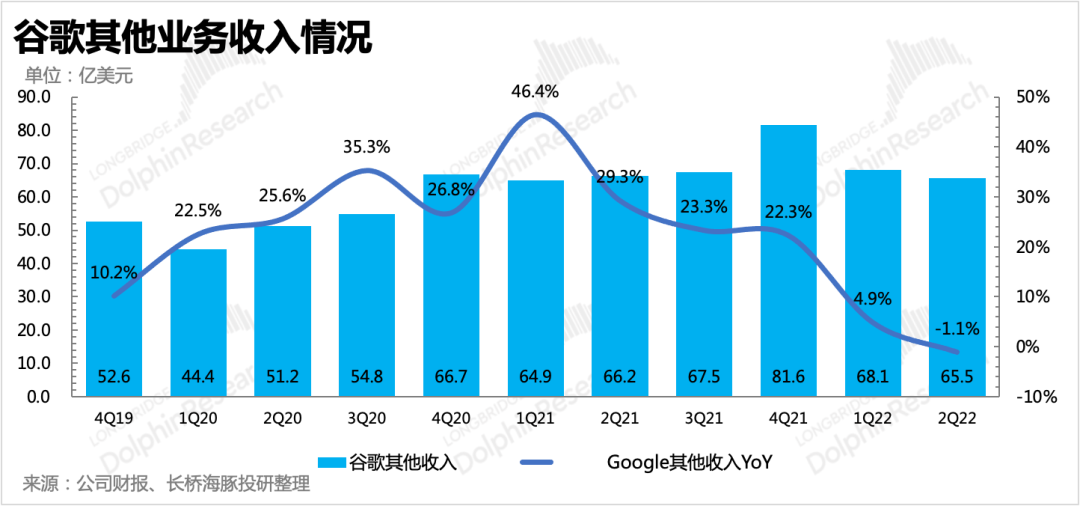 二季度以Google Play、YouTube訂閱、智能硬件為主的其他谷歌服務(wù),實(shí)現(xiàn)收入65.5億元。