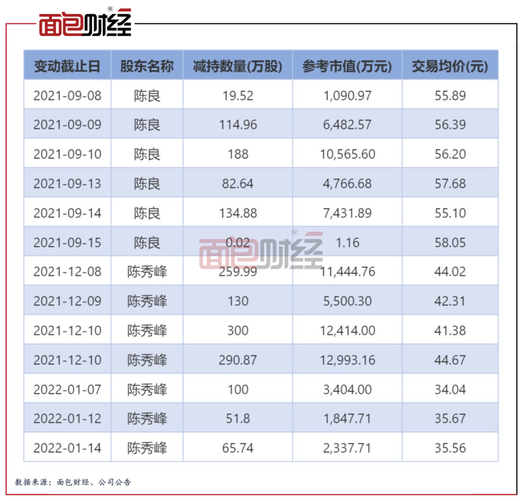 2021年9月初至今,星源材質(zhì)控股股東、實(shí)控人陳秀峰和陳良合計(jì)減持超1700萬股,共套現(xiàn)超8億元。集中減持的時(shí)間段有2021年9月、2021年12月和2022年1月,兩位股東的減持交易均價(jià)分別約為56元/股、43元/股和35元/股。對(duì)比公司當(dāng)前約30元/股的前復(fù)權(quán)股價(jià),兩名重要股東減持時(shí)的公司股價(jià)相對(duì)處于高位。