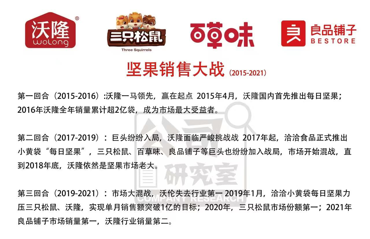 無(wú)論如何,在激烈的市場(chǎng)競(jìng)爭(zhēng)中,沃隆食品最終失去了堅(jiān)果市場(chǎng)老大地位。2020年,三只松鼠成為行業(yè)第一,市場(chǎng)份額為10.2%;2021年,洽洽食品取代三只松鼠,市場(chǎng)份額為9.7%。當(dāng)年,沃隆食品銷(xiāo)量第二,市場(chǎng)份額為 9.3%。