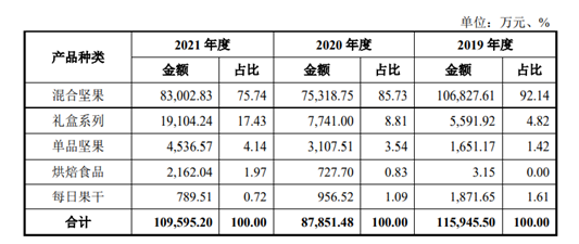誠(chéng)然,單從營(yíng)收看,在2019年、2020年和2021年內(nèi),沃隆食品的營(yíng)收有所波動(dòng),實(shí)現(xiàn)營(yíng)收分別為11.65億元、8.89億元和11.08億元。相比之下,同處堅(jiān)果賽道的部分競(jìng)品,2021年良品鋪?zhàn)?、三只松鼠與洽洽食品的營(yíng)收高達(dá)93.24億元、97.7億元與59.85億元。