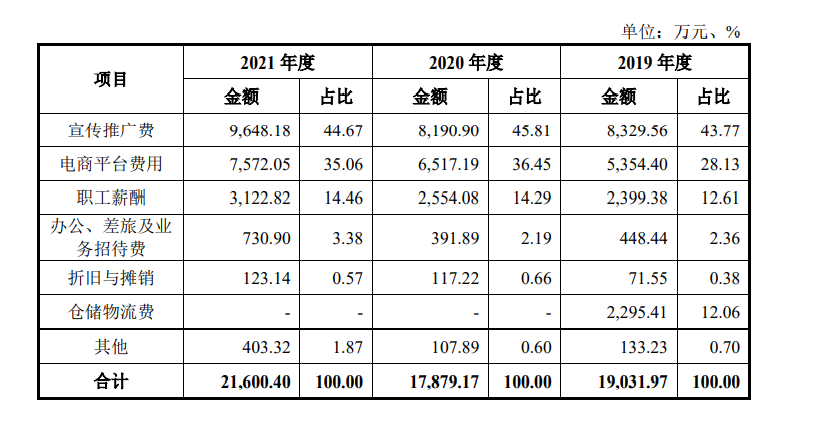 公司稱(chēng),由于近年來(lái)競(jìng)品增多,公司逐步加強(qiáng)了線下渠道建設(shè)和推廣力度,總體上增加了對(duì)宣傳推廣費(fèi)的支出。電商平臺(tái)費(fèi)用主要為公司在天貓、京東等電商平臺(tái)上的推廣費(fèi)用,報(bào)告期內(nèi) 公司逐步加強(qiáng)對(duì)電商平臺(tái)的資源投入,電商平臺(tái)費(fèi)用持續(xù)增長(zhǎng),線上渠道的收入規(guī)模亦同步增長(zhǎng)。職工薪酬主要系當(dāng)期銷(xiāo)售人員薪酬,報(bào)告期內(nèi)總體穩(wěn)定。