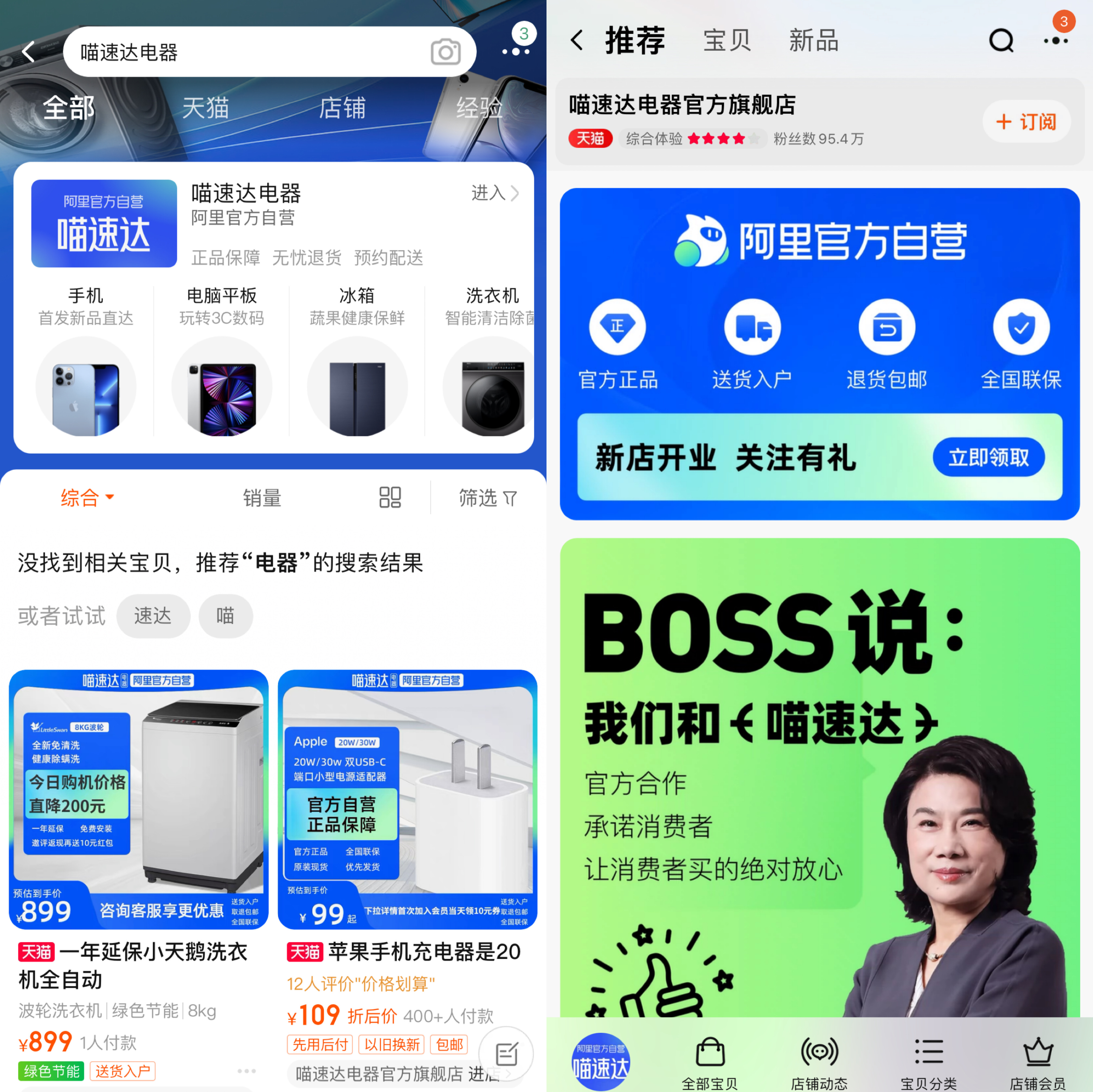此次新增的喵速達(dá)電器,于2022年4月29日正式在天貓上線。打開(kāi)喵速達(dá)電器官方旗艦店,可以看到其介紹為阿里自營(yíng)電器業(yè)務(wù),從3C品類入手,主要圍繞大品牌,商品覆蓋手機(jī)、電腦平板、冰箱、洗衣機(jī)、數(shù)碼配件、家電等品類。