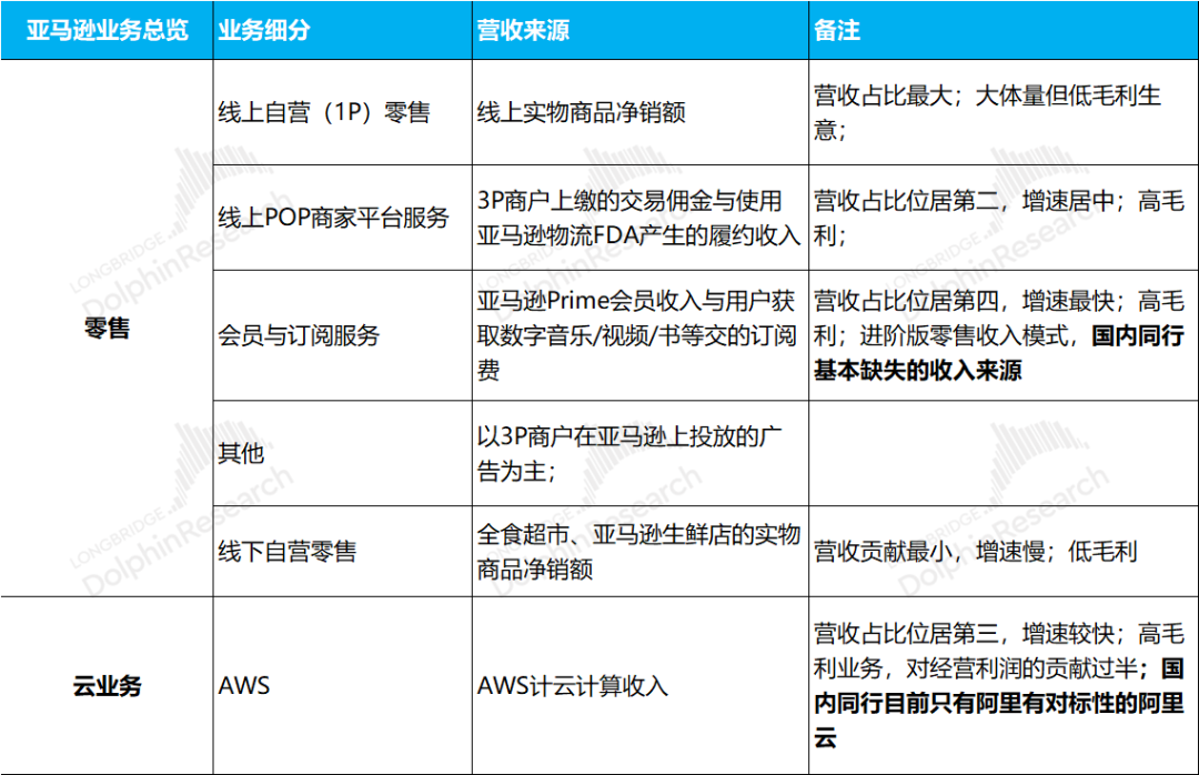 從收入結(jié)構(gòu)來看,亞馬遜的業(yè)務(wù)主要分為零售相關(guān)業(yè)務(wù)和云服務(wù)兩大類。其中零售大類可細分為線上自營、線上3P賣家服務(wù)(傭金與履約費)、線上廣告、會員與訂閱服務(wù),及線下零售業(yè)務(wù)。
